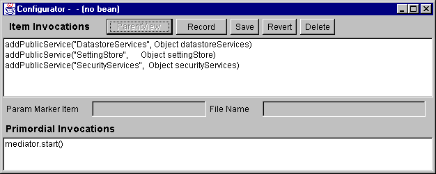 Configurator - This contains the configuration for a single System Tree node. At a minimum this is the item's name. For containers it may include initial and primordial invocations. For workers (beans) it may include initialization invocations. Invocations are usually property settings and event registrations, but may be any public method invocation. Arguments may be literals or item names.