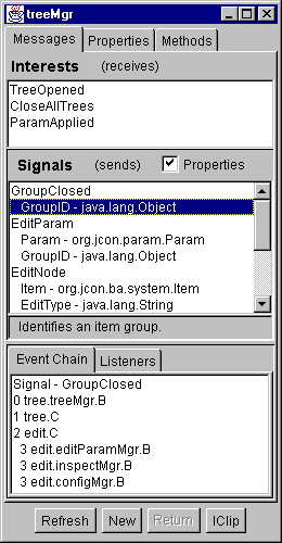 - The Messages tab shows the messages the bean receives and sends, complete with the ability to examine a message event chain from source to listener.