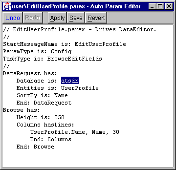 Shown are parameters used to drive a reusable DataEditor subsystem of 50 classes. The task is to edit the UserProfile table. The parameters are "expanded" into 140 lines of parameters using the Data Framework schema and a meta parameter subsystem. The expanded parameters are then passed to the DataEditor instance via setParam(Param param). The largest parameter file so far is 800 lines. It's used to edit a parent and 2 child tables, using 3 tabs and 8 datasets. It replaces about 3000 lines of totally unreadable code. See more parameter examples.