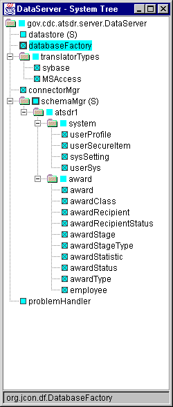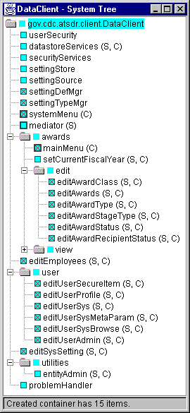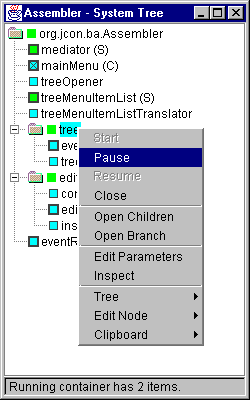 The System Tree is the core tool for the BA. It's a standard hierarchical tree. Each node is an instance when the system is running. Each node can be inspected, though this is more interesting for worker (Bean) nodes. The use of a tree allows the user to easily conceptualize the entire system at any stage: new tree with just a root container node, a few more nodes and the first running iteration, lots more nodes and a release, and system evolution.