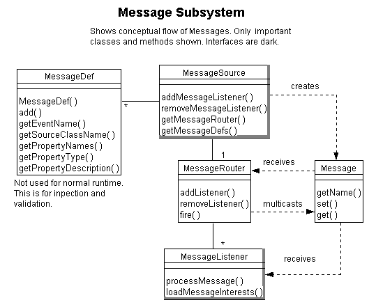 Messages are sent from a MessageSource to zero or more MessageListeners. These interfaces can be implemented by any class. Listeners listen for just the Message names they're interested in. When a Message is sent, it only goes to listeners interested in that Message name. To make this easier to implement, sources use a MessageRouter to add listeners to and to send Messages.