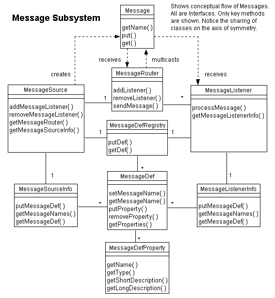 // Sent from a MessageSource to its MessageListeners. public interface Message extends PropMap, Cloneable, Serializable { // Additional methods not in PropMap are: // Note name and isAcquire are set only via constructors public String getName(); // The name is immutable // Future use - public boolean isAcquire(); // If true acquire properties can be set public Object clone(String messageName); } // Allows listening to Messages of interest. public interface MessageListener extends MessageDefRegistryUser { public void processMessage(Message message); public MessageListenerInfo getMessageListenerInfo(); } // Allows subscription to named Messages, sends Messages to subscribers. public interface MessageSource extends MessageDefRegistryUser { public void addMessageListener(String eventName, MessageListener listener); public void removeMessageListener(String eventName, MessageListener listener); public MessageRouter getMessageRouter(); // For tool use only public MessageSourceInfo getMessageSourceInfo(); } // Allows a shared mechanism to be provided public interface MessageDefRegistryUser { public void setMessageRegistry(MessageDefRegistry registry); } // Routes Messages to subscribers. Most MessagesSources have one of these. // Null is not allowed for messageName unless indicated. // Note - Getting top big when added filters, needs subdividing public interface MessageRouter extends BasicPropMap { // Additional methods not in BasicPropMap follow. Some are just for clarity. public void addListener(String messageName, MessageListener listener); public void removeListener(String messageName, MessageListener listener); public boolean hasListener(String messageName, MessageListener listener); public boolean hasListener(String messageName); public Enumeration getMessageNames(); public Enumeration getMessageListeners(String messageName); // null for all public Enumeration getMessageNamesWithListener(MessageListener listener); // Messages can be reused and resent for speed, to avoid creating new // objects. Thus listeners should NOT keep a reference to Messages received. // If they need it, clone it. // The second is a convenience method, for Messages with no properties. public boolean sendMessage(Message message, Object source); public boolean sendMessage(String messageName, Object source); // For filters, a new feature. A messageName of null means all. // *** Change of design - Do not do filter feature now public void addPreFilter(String messageName, MessagePreFilter filter); public void removePreFilter(String messageName, MessagePreFilter filter); public Enumeration getPreFilters(String messageName); public void addPostFilter(String messageName, MessagePostFilter filter); public void removePostFilter(String messageName, MessagePostFilter filter); public Enumeration getPostFilters(String messageName); } // QUESTIONS - Do we need a "MessageCastFilter" that's called before // each cast? Does the router need to be in the filter call arguments? // Filters are designed to allow observing, modifying and/or canceling Message // multicasts, either before or after each multicast. Their use is optional. public interface MessagePreFilter { // Called before a Message is multicast. The returned Message is the one // ultimately multicast. Returning null means the Message should not be sent. public Message preFilterMessage(Message message); } public interface MessagePostFilter { // Called after a Message is multicast. The returned Message is the one // used in the next postFilterMessage() call, if any. Returning null means // further postFilterMessage() calls, if any, should stop. public Message postFilterMessage(Message message); } // Contains MessageDefs the listener is interested in processing. Will evolve. public interface MessageListenerInfo { public void setMessageDef(MessageDef def); public Enumeration getMessageNames(); public MessageDef getMessageDef(String messageName); public Enumeration getMessageDefs(); } // Contains MessageDefs that can be sent. Will evolve. // Note similarity to MessageListenerInfo. They may evolve differently. public interface MessageSourceInfo { public void setMessageDef(MessageDef def); public Enumeration getMessageNames(); public MessageDef getMessageDef(String messageName); public Enumeration getMessageDefs(); } // Defines the structure of a Message, which is its name and properties. public interface MessageDef { public void setMessageName(String messageName); public String getMessageName(); public void setProperty(MessageDefProperty property); public void setProperty(String propertyName, Class type, String shortDescription); public MessageDefProperty removeProperty(String propertyName); public Enumeration getPropertyNames(); public MessageDefProperty getProperty(String propertyName); public Enumeration getProperties(); } // Defines a single Message property. public interface MessageDefProperty { public void setName(String name); public String getName(); public void setType(Class type); public Class getType(); // Future feature - public void setAcquire(boolean isAcquire); // Future feature - public boolean isAcquire(); // If true property can be set by listeners public void setShortDescription(String shortDescription); public String getShortDescription(); public void setLongDescription(String longDescription); public String getLongDescription(); } // A registry containing MessageDefs that clients such as sources and listeners // can refer to instead of having to create their own MessageDefs. They use // getDef() or the create convenience methods. The design is NOT complete public interface MessageDefRegistry implements PropMap { // Additional methods not in PropMap are: (may add more convenience methods) public void setDef(MessageDef def); public void replaceDef(MessageDef def); public Iterator getMessageNames(); public MessageDef getDef(String messageName); public Iterator getDefs(); // These are convenience methods: public MessageListenerInfo createMessageListenerInfo(String m