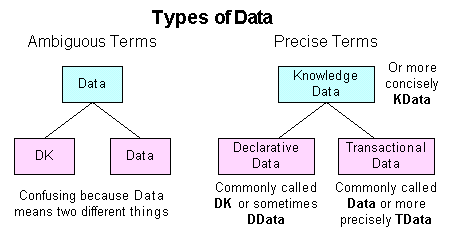 Data - Since we have introduced the concept of Declarative Knowledge (DK), we need to precisely define data to avoid ambiguity in systems that have DK and data. DK versus data is confusing because DK is intuitively a type of data. There are really 3 concepts involved, which are confusing if only 2 words are used, as in the left side of the below diagram. Therefore we introduce the higher level concept of Knowledge, which has two subtypes: Declarative and Transactional, as shown in the right side of the diagram. When we say "data", we usually mean "Transactional Data".