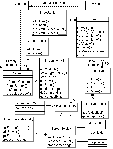 Here's the Object Model for the Modular Screen Subsystem. We have cropped a portion of the actual model to get it to fit on this page. The objects with dark borders are interfaces, allowing the framework to be very extensible.