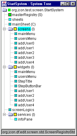 screenContext.startScreen("Screen1")Usually you design the System Tree before the Object Model, especially if the system is similar to one you are familiar with. Here's an early iteration of the System Tree for the MSS. Note how class names changed considerably later.