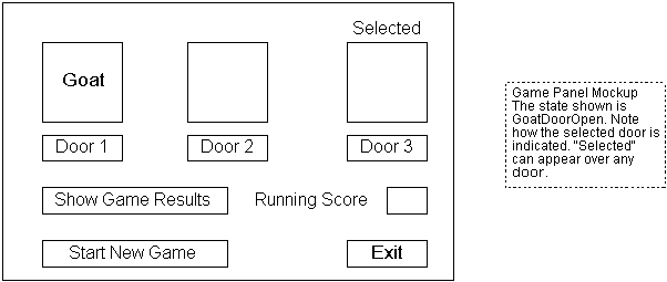 The game player should present two visual "Game Windows", each of which is a complete game. A Game Window has three doors, a button to open each door, and a running score showing the total won, lost and percent won. When a game starts, all three doors are closed. The user then clicks on one door button, and that door is shown as "selected". The host then opens one of the other doors, revealing the goat. The user can then click on the other unopened door to choose it, or they can keep their first choice. The user then clicks on Show Game Result. All unopened doors open and the score is updated. The user can then click on Start New Game, and the whole thing starts over, except for the running score which is maintained.