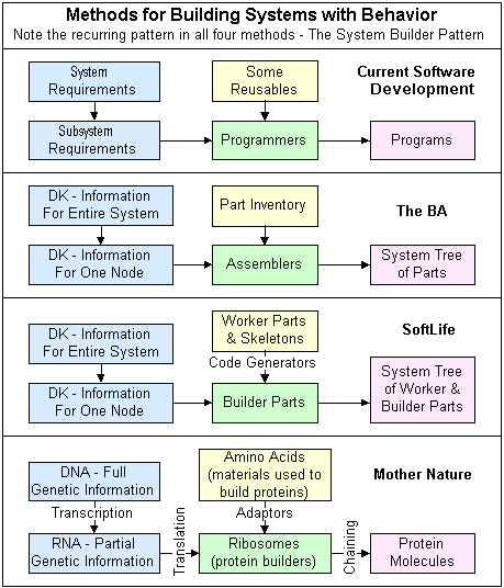 The SoftLife diagram is merely speculative. We really don't know exactly how the yellow and green areas (and Code Generators) would look. But it would be something like this, with the same pattern strategy as the others, particularaly Mother Nature. The important issue is that SoftLife is not a huge jump from The BA version - It's just an incremental step. This should give us the confidence it can be done, because it looks downright difficult until we've done it. :-)