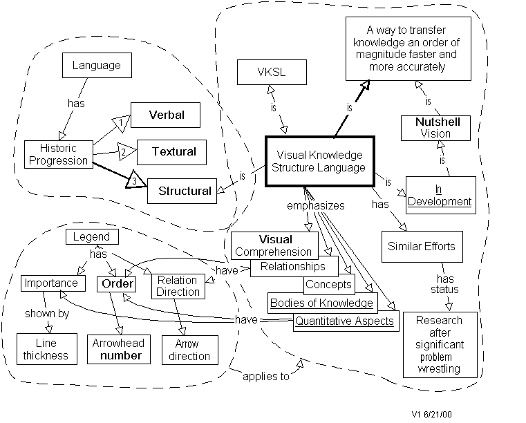 6/22/00 - 1st Experiment - The JSL Study Group jumped in the water with Visual Knowledge Structure Language, or VKSL. First they did an experiment to see if VKSL was better than normal text. Then we discussed VKSL. Then they broke into groups of 2 to develop their own approach. At the end some of the groups reported on their observations, and the tabulated results of the experiment were reviewed. VKSL was 26% faster than text and about the same accuracy. I had expected a larger difference, but at least we got some.