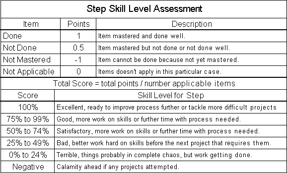 By mastered we mean you know how to do it really well, and using the item is intuitive and painless. You don't have to be an expert, just very competent. Note there's no "Not Done Well" category. That's because things like this are better treated as boolean, where either the practice is done or not done. If it's not done well it's best to face reality and call it not done, to avoid fooling yourself. There is no such thing as partial high quality. One quickly realizes the best way to improve a step is to master all required skills. This requires much training and self study, and is far more important than the process itself. A process only leverages a group's technical skills. It doesn't replace them.
