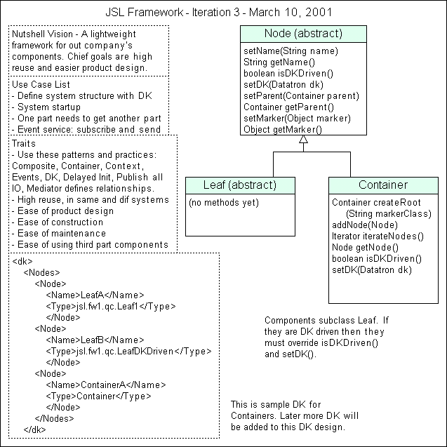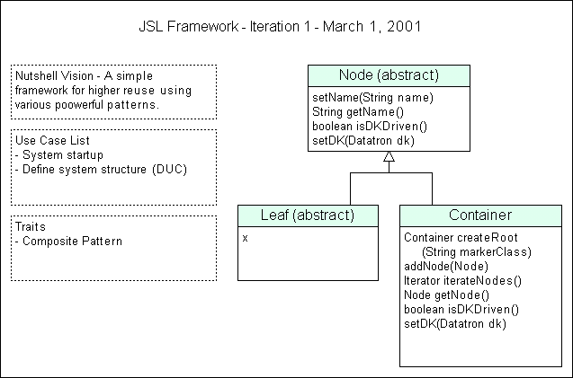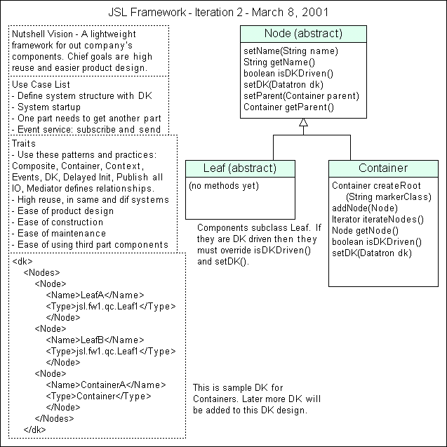 Download Iteration 2 with one WinZip file. Study the file structure and code closely. Run the test with "java jsl.fw1.qc.System1Test". Try making changes to the _Container.DK file to see what happens in your ouput. For example add another leaf and container. For quick reference the iteration 2 artifacts are: