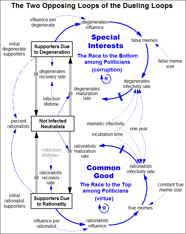 On the right are the core feedback loops of the Dueling Loops model. These two loops appear to explain why the human system has so far been unable to solve the sustainability problem. Fortunately these loops can tell us much more. By expanding the model to include more relevant detail, we can drill down to the fundamental layer of the problem and find its root causes. That data, once refined and confirmed by further research, will lead to solution.
